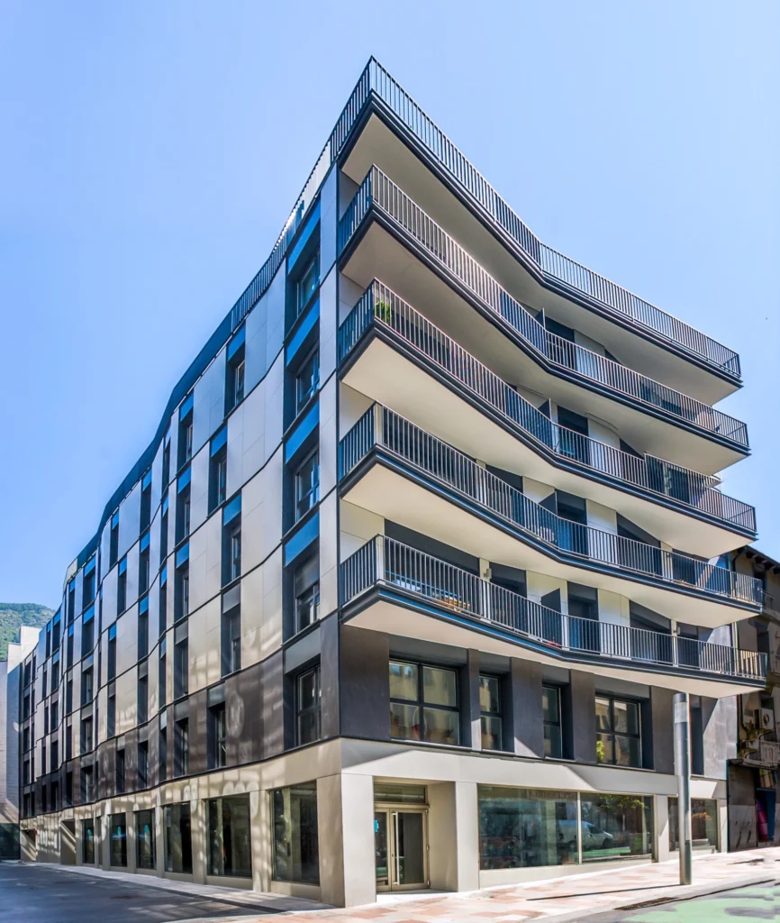 Engitec ha liderat la transformació arquitectònica de l’antic Hostal Andorrà, convertint una estructura malmesa en un edifici nou que aporta llum i personalitat al carreró d’accés. La parcel·la estreta i llarga permet que tots els habitatges siguin exteriors, sense necessitat de patis de llums. La façana amb volum, línies rectes i geometries simples genera sensació de moviment i amplia visualment l’espai, mentre els tons gris clar i gairebé blanc aporten lluminositat. L’edifici compta amb 26 habitatges de lloguer, tres plantes de pàrquing, aïllament tèrmic i acústic d’alta eficiència, aerotèrmia i materials de qualitat que garanteixen confort i sostenibilitat.